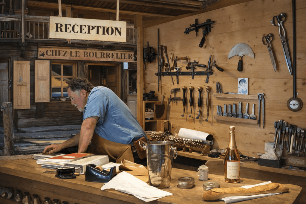 CHEZ LE BOURRELIER au Grand-Bornand est bien plus qu’une simple boutique, c’est également un atelier où l’on peut voir Didier Perrillat, Maître Artisan Bourrelier, travailler pour préparer ses commandes.